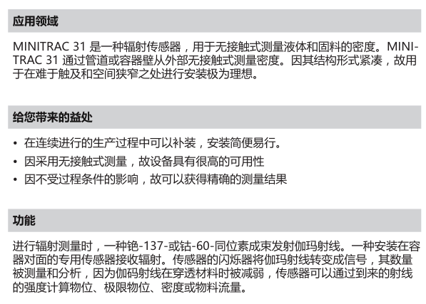 MINITRAC 31 是一款非接触式同位素仪表,用于测量液体或固料的密度。MINITRAC 31 无需接触介质,可穿透管道或罐壁进行密度测量。仪表结构紧凑,非常适合安装在难以接触的测量点或狭小空间内。